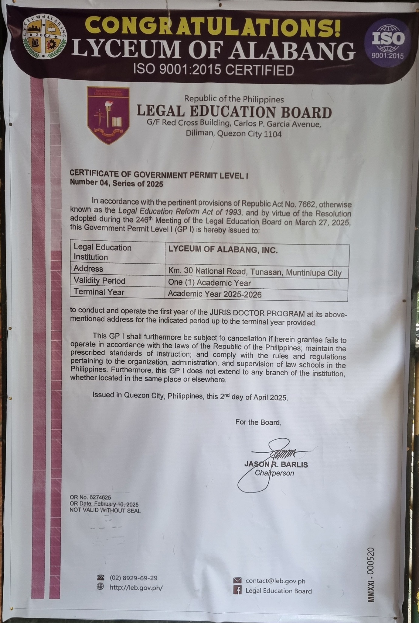 Congratulations, Lyceum of Alabang! We proudly celebrate the granting of the Government Permit Level I by the Legal Education Board to offer the Juris Doctor Program starting Academic Year 2025–2026. This milestone reflects our commitment to providing quality legal education and shaping future champions in the field of law.